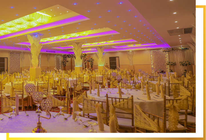 A magical ambient interior with hand-carved walls, the phenomenal architecture covering the pillars, and royal vine carpet are set to reflect your dreamy wedding. The floral lamp shades with the spotlights illuminate and highlight every little thing on your occasion.So this site will cherish in the memory of the bride, groom and all the guests!